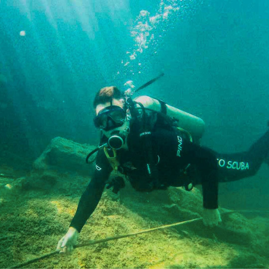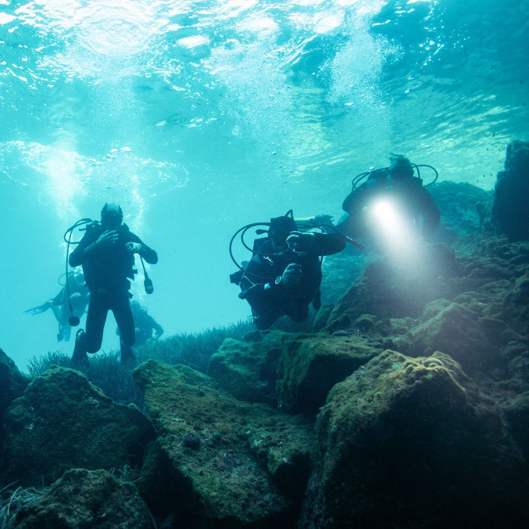 Durante o mergulho, é possível observar a fauna aquática da região, incluindo peixes e vegetação subaquática, em um ambiente de águas cristalinas.